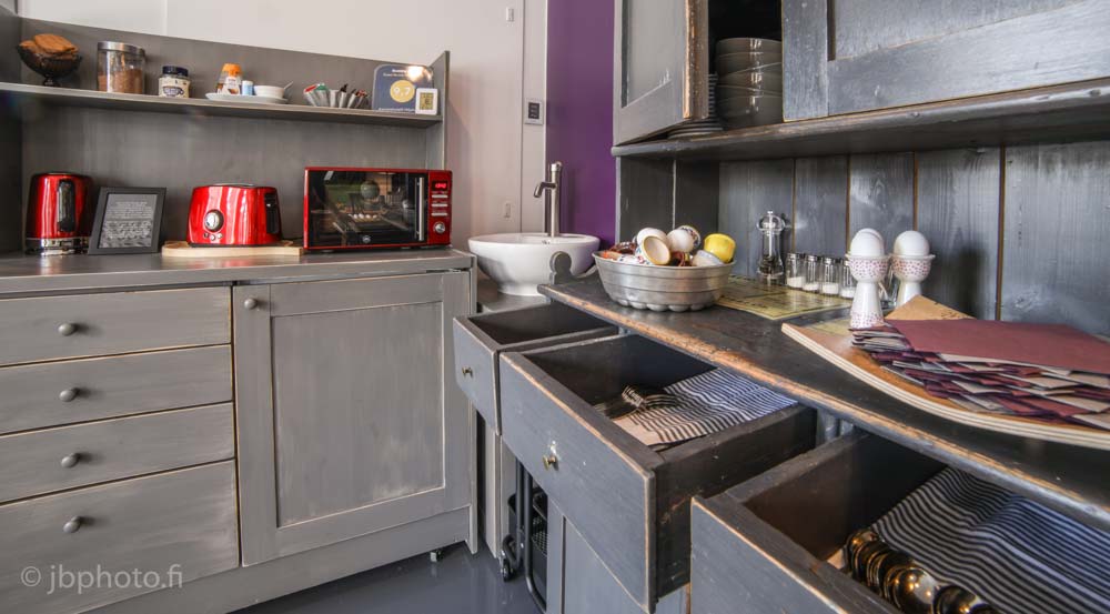 Omien eväiden nauttimista varten käytettävissä on olohuone, josta löytyy jääkaappi, mikro ja vedenkeitin kahvi- ja teetarvikkeineen. Lisäksi vieraidemme käytössä on sauna, jonka pehmeisiin löylyihin saa huonekohtaisesti varata oman saunavuoron.